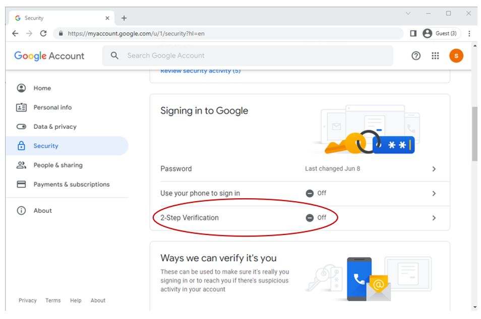 4) Scroll down to the Signing into Google section and turn on 2-Step Verification (if it is not already enabled). Follow the onscreen instructions to add/verify your phone number