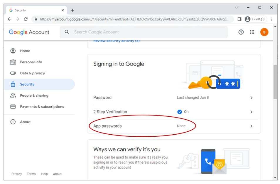 5) Return to the Security menu and you should now find the App passwords option under Signing into Google. Click on App passwords.